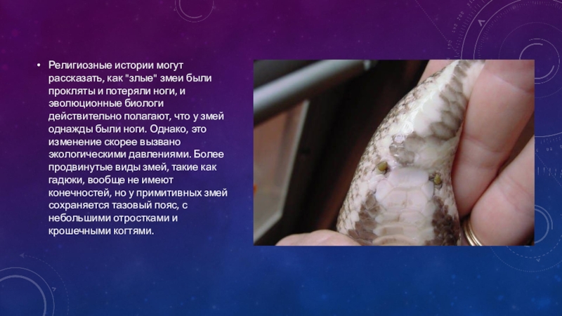 Слайд 7Религиозные истории могут рассказать, как "злые" змеи были прокляты и потеряли