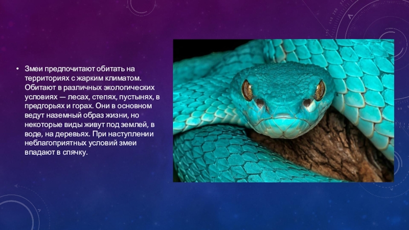 экологических условиях — лесах, степях, пустынях, в предгорьях и горах. Они в основном ведут наземный образ жизни, но некоторые виды живут под землей, в воде, на деревьях. При наступлении неблагоприятных условий змеи впадают в спячку.