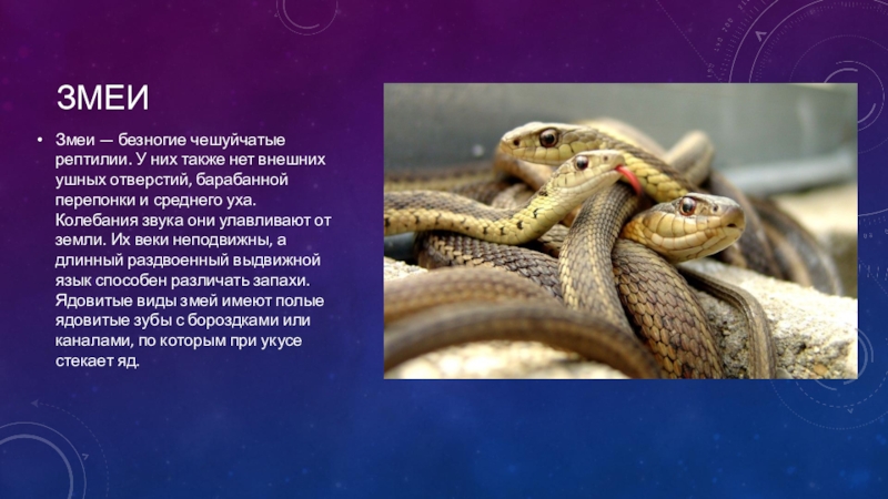 отверстий, барабанной перепонки и среднего уха. Колебания звука они улавливают от земли. Их веки неподвижны, а длинный раздвоенный выдвижной язык способен различать запахи. Ядовитые виды змей имеют полые ядовитые зубы с бороздками или каналами, по которым при укусе стекает яд.