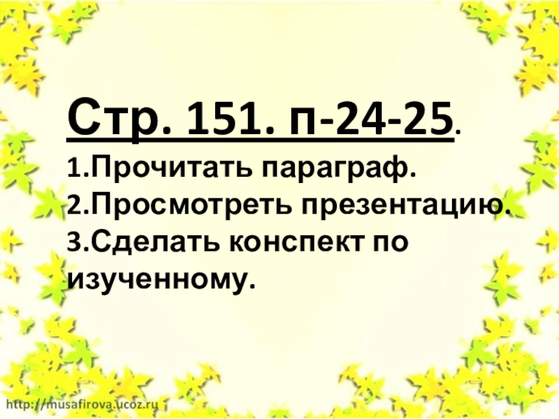 Стр. 151. п-24-25.1.Прочитать параграф.2.Просмотреть презентацию.3.Сделать конспект по изученному.