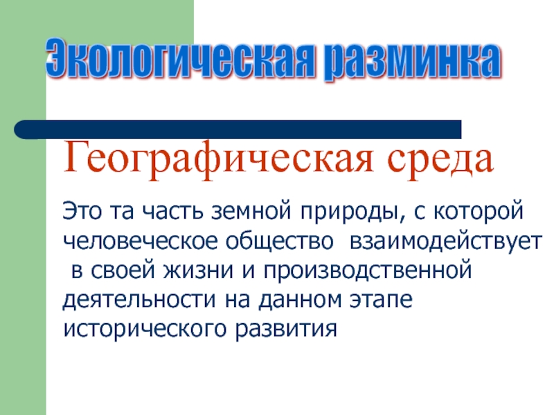 Экологическая разминкаГеографическая средаЭто та часть земной природы, с которойчеловеческое общество взаимодействует в своей жизни и производственной деятельности