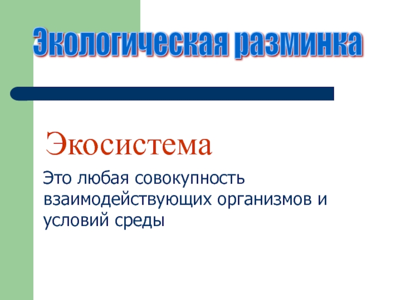 Экологическая разминкаЭкосистемаЭто любая совокупность взаимодействующих организмов и условий среды