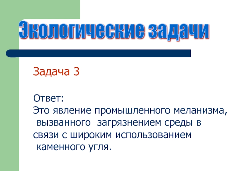 Экологические задачиЗадача 3Ответ:Это явление промышленного меланизма, вызванного загрязнением среды в связи с широким использованием каменного угля.