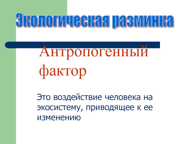 Экологическая разминкаАнтропогенный факторЭто воздействие человека на экосистему, приводящее к ее изменению
