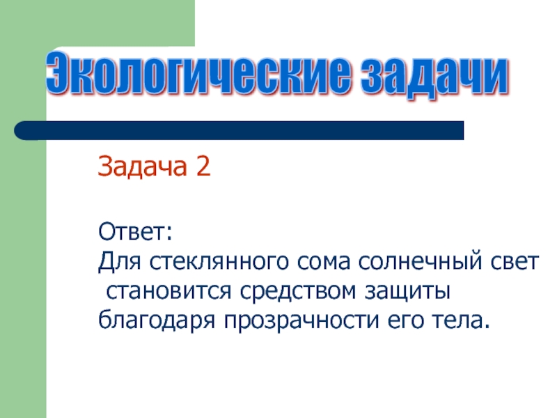 Экологические задачиЗадача 2Ответ:Для стеклянного сома солнечный свет становится средством защиты благодаря прозрачности его тела.