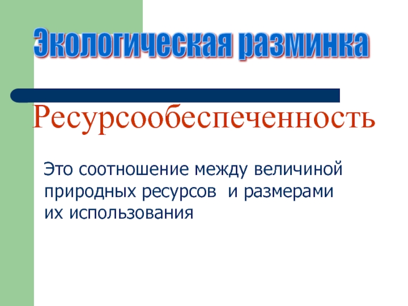 Экологическая разминкаРесурсообеспеченностьЭто соотношение между величиной природных ресурсов и размерами их использования