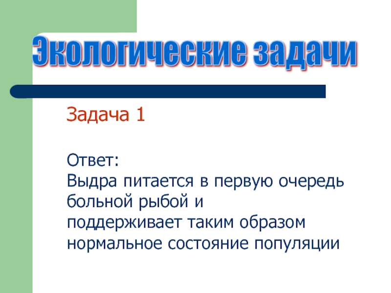 Экологические задачиЗадача 1Ответ:Выдра питается в первую очередь больной рыбой и поддерживает таким образом нормальное состояние популяции
