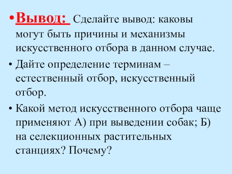 2.Сделать предположение о причинах и механизме искусственного отбора
