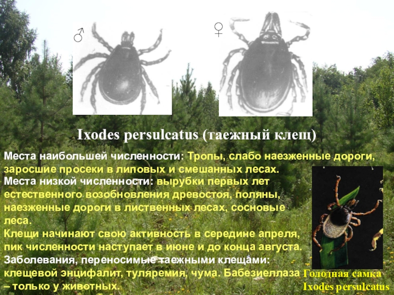 Заболевания, переносимые таежными клещами: клещевой энцифалит, туляремия, чума. Бабезиеллаза – только у животных.