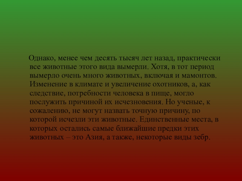 животные этого вида вымерли. Хотя, в тот период вымерло очень много животных, включая и мамонтов. Изменение в климате и увеличение охотников, а, как следствие, потребности человека в пище, могло послужить причиной их исчезновения. Но ученые, к сожалению, не могут назвать точную причину, по которой исчезли эти животные. Единственные места, в которых остались самые ближайшие предки этих животных – это Азия, а также, некоторые виды зебр.