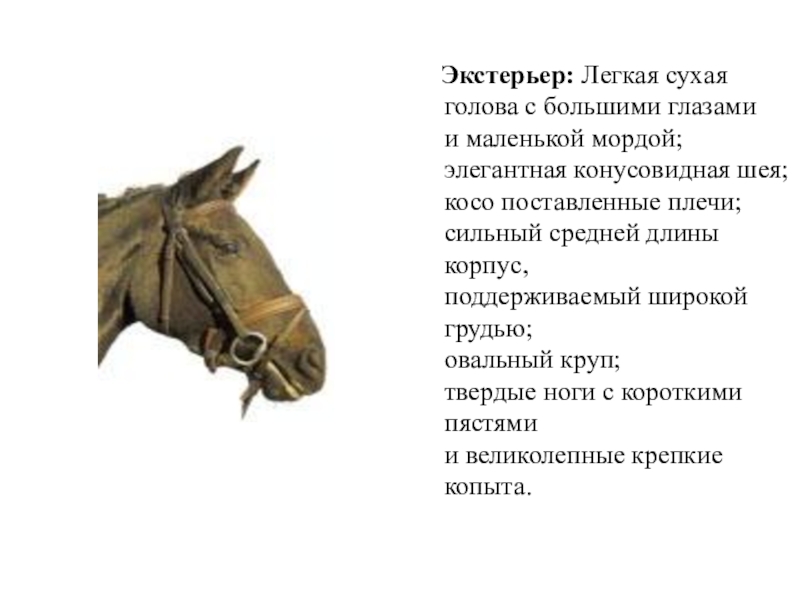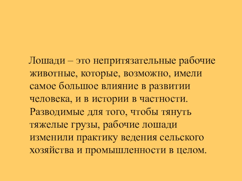 Слайд 9 Лошади – это непритязательные рабочие животные, которые, возможно, имели