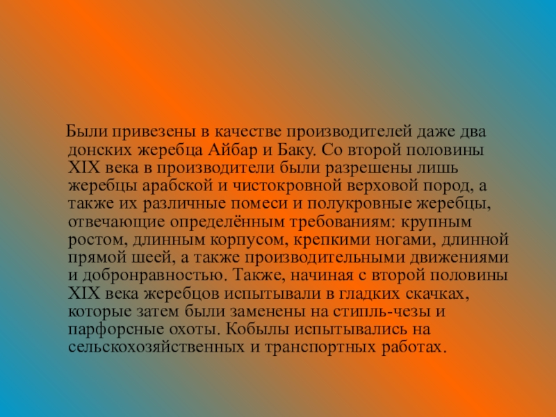 Слайд 12 Были привезены в качестве производителей даже два донских жеребца