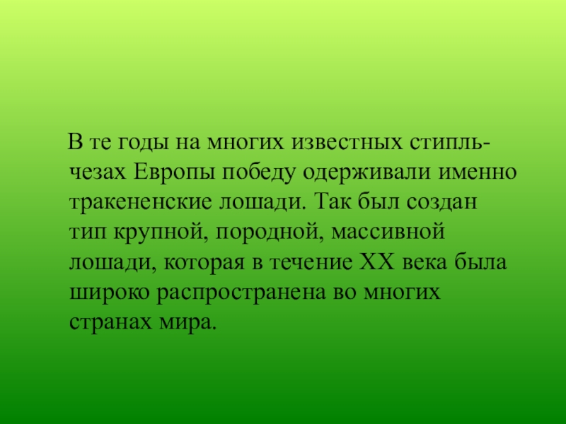 одерживали именно тракененские лошади. Так был создан тип крупной, породной, массивной лошади, которая в течение XX века была широко распространена во многих странах мира.