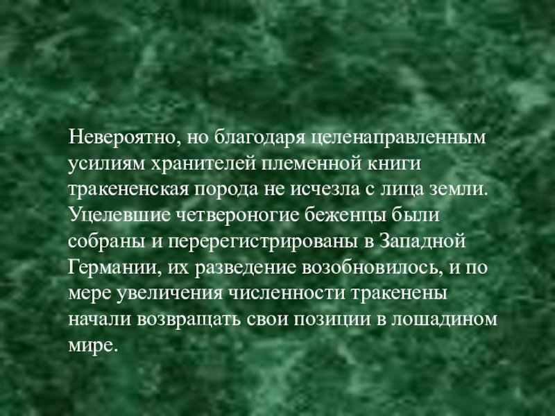 Слайд 16 Невероятно, но благодаря целенаправленным усилиям хранителей племенной книги тракененская