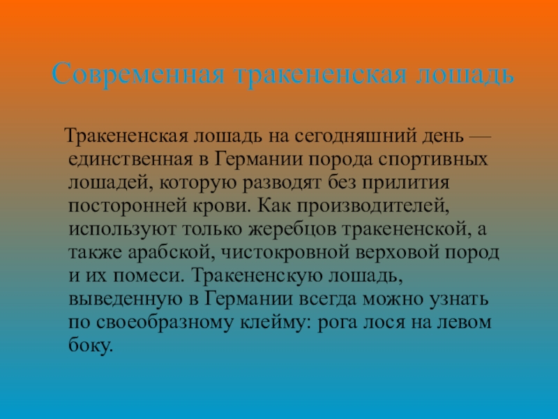 в Германии порода спортивных лошадей, которую разводят без прилития посторонней крови. Как производителей, используют только жеребцов тракененской, а также арабской, чистокровной верховой пород и их помеси. Тракененскую лошадь, выведенную в Германии всегда можно узнать по своеобразному клейму: рога лося на левом боку.