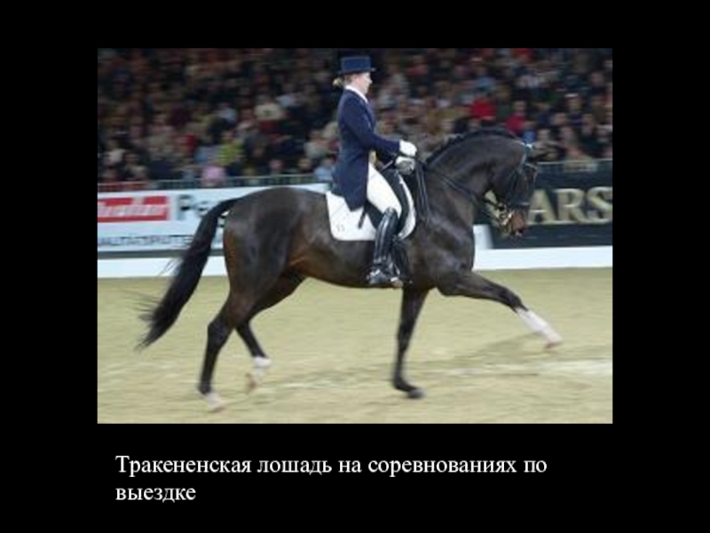 Слайд 21Тракененская лошадь на соревнованиях по выездке