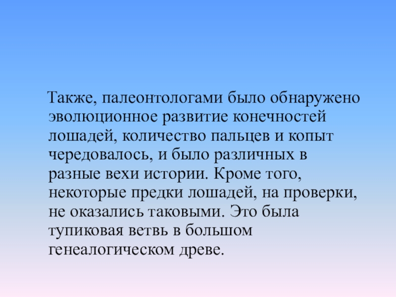 Слайд 3 Также, палеонтологами было обнаружено эволюционное развитие конечностей лошадей, количество