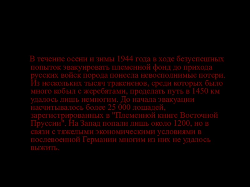 безуспешных попыток эвакуировать племенной фонд до прихода русских войск порода понесла невосполнимые потери. Из нескольких тысяч тракененов, среди которых было много кобыл с жеребятами, проделать путь в 1450 км удалось лишь немногим. До начала эвакуации насчитывалось более 25 000 лошадей, зарегистрированных в "Племенной книге Восточной Пруссии". На Запад попали лишь около 1200, но в связи с тяжелыми экономическими условиями в послевоенной Германии многим из них не удалось выжить.