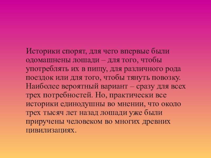 Слайд 8 Историки спорят, для чего впервые были одомашнены лошади –