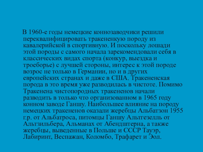 Слайд 17 В 1960-е годы немецкие коннозаводчики решили переквалифицировать тракененкую породу