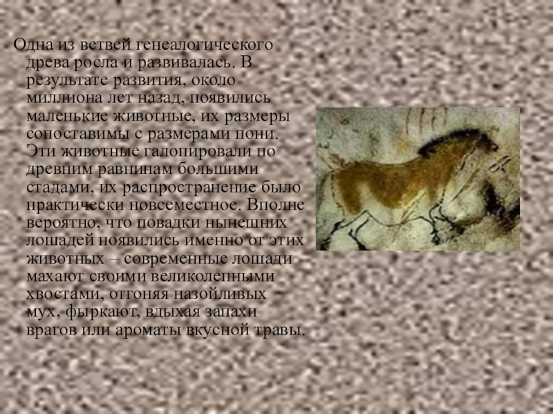 результате развития, около миллиона лет назад, появились маленькие животные, их размеры сопоставимы с размерами пони. Эти животные галопировали по древним равнинам большими стадами, их распространение было практически повсеместное. Вполне вероятно, что повадки нынешних лошадей появились именно от этих животных – современные лошади махают своими великолепными хвостами, отгоняя назойливых мух, фыркают, вдыхая запахи врагов или ароматы вкусной травы.