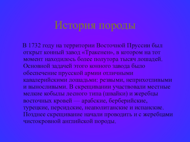 открыт конный завод «Тракенен», в котором на тот момент находилось более полутора тысяч лошадей. Основной задачей этого конного завода было обеспечение прусской армии отличными кавалерийскими лошадьми: резвыми, неприхотливыми и выносливыми. В скрещивании участвовали местные мелкие кобылы лесного типа (швайки) и жеребцы восточных кровей — арабские, берберийские, турецкие, персидские, неаполитанские и испанские. Позднее скрещивание начали проводить и с жеребцами чистокровной английской породы.