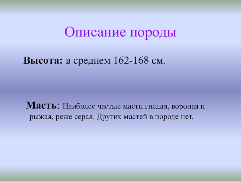 Наиболее частые масти гнедая, вороная и рыжая, реже серая. Других мастей в породе нет.