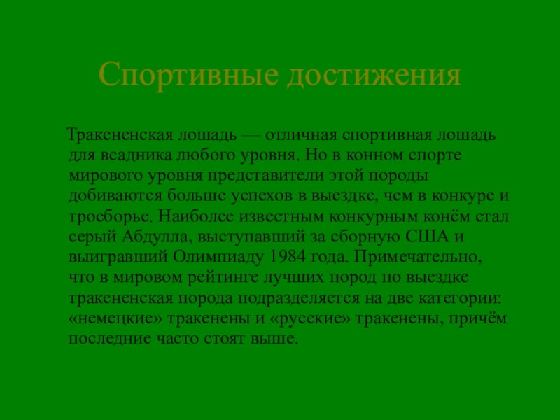 любого уровня. Но в конном спорте мирового уровня представители этой породы добиваются больше успехов в выездке, чем в конкуре и троеборье. Наиболее известным конкурным конём стал серый Абдулла, выступавший за сборную США и выигравший Олимпиаду 1984 года. Примечательно, что в мировом рейтинге лучших пород по выездке тракененская порода подразделяется на две категории: «немецкие» тракенены и «русские» тракенены, причём последние часто стоят выше.