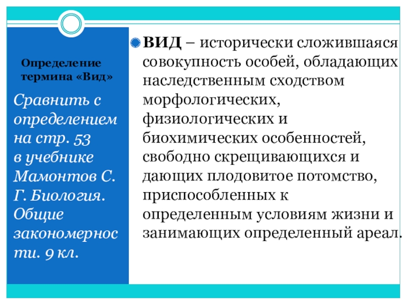 ВИД – исторически сложившаяся совокупность особей, обладающих наследственным сходством морфологических, физиологических и биохимических особенностей, свободно скрещивающихся и дающих плодовитое потомство, приспособленных к определенным условиям жизни и занимающих определенный ареал.