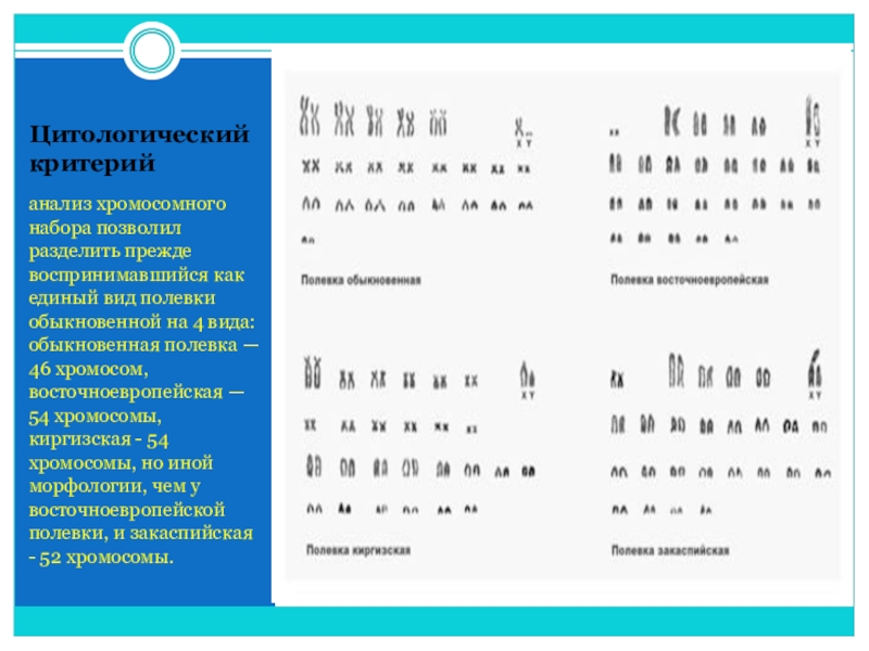 полевки обыкновенной на 4 вида: обыкновенная полевка — 46 хромосом, восточноевропейская — 54 хромосомы, киргизская - 54 хромосомы, но иной морфологии, чем у восточноевропейской полевки, и закаспийская - 52 хромосомы.