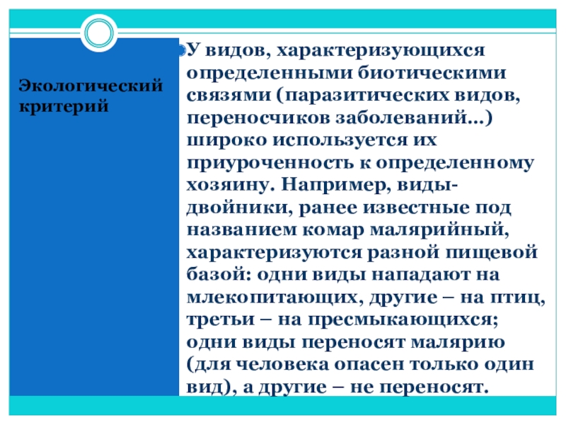 широко используется их приуроченность к определенному хозяину. Например, виды-двойники, ранее известные под названием комар малярийный, характеризуются разной пищевой базой: одни виды нападают на млекопитающих, другие – на птиц, третьи – на пресмыкающихся; одни виды переносят малярию (для человека опасен только один вид), а другие – не переносят.