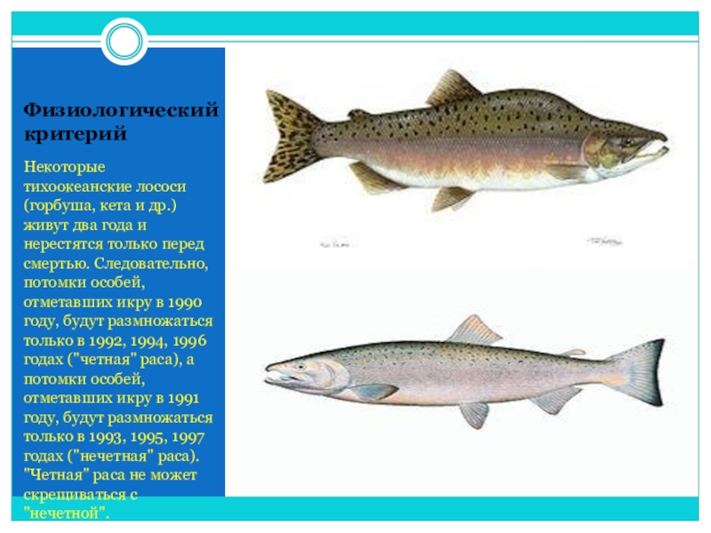 и нерестятся только перед смертью. Следовательно, потомки особей, отметавших икру в 1990 году, будут размножаться только в 1992, 1994, 1996 годах ("четная" раса), а потомки особей, отметавших икру в 1991 году, будут размножаться только в 1993, 1995, 1997 годах ("нечетная" раса). "Четная" раса не может скрещиваться с "нечетной".