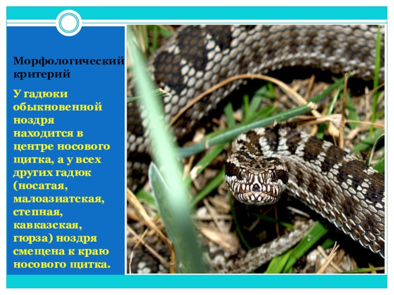 у всех других гадюк (носатая, малоазиатская, степная, кавказская, гюрза) ноздря смещена к краю носового щитка.