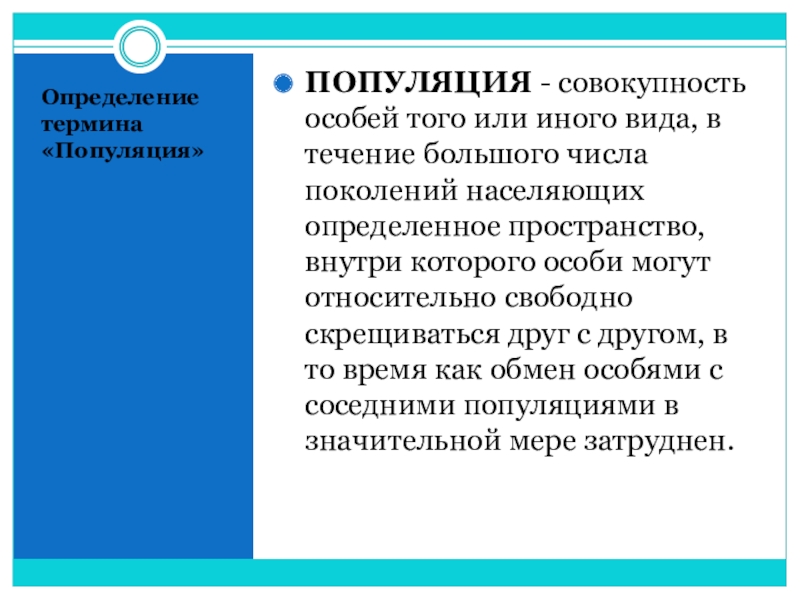 течение большого числа поколений населяющих определенное пространство, внутри которого особи могут относительно свободно скрещиваться друг с другом, в то время как обмен особями с соседними популяциями в значительной мере затруднен.