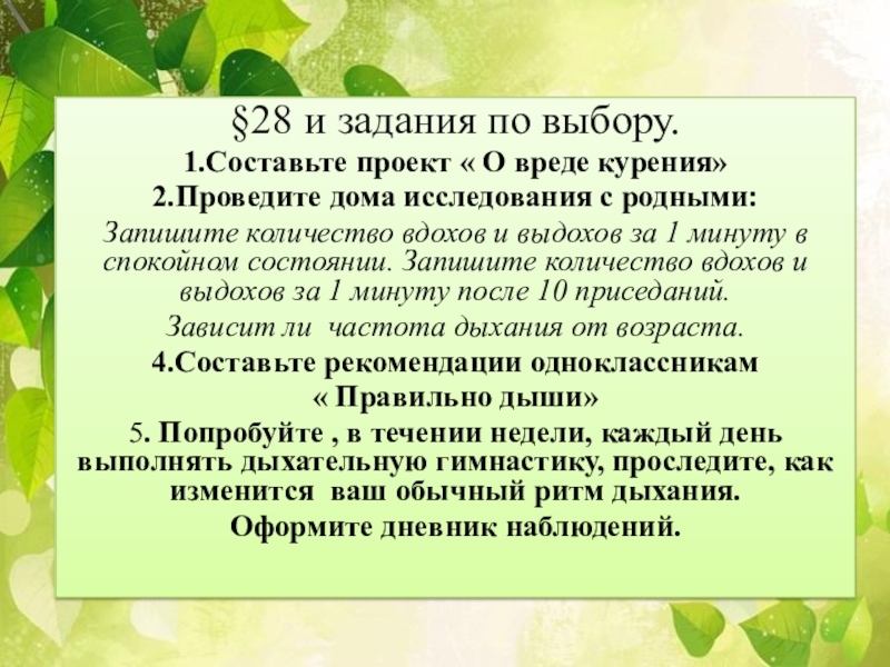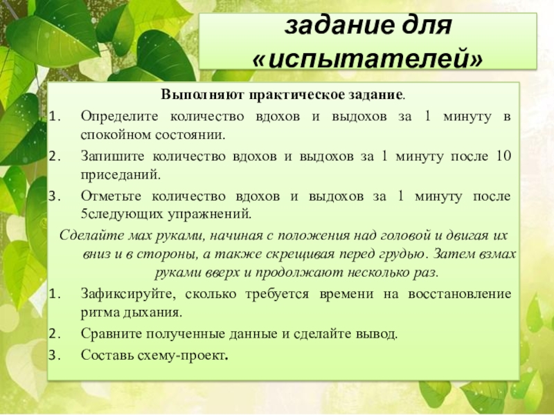 Запишите количество вдохов и выдохов за 1 минуту в спокойном состоянии. Запишите количество вдохов и выдохов за 1 минуту после 10 приседаний.