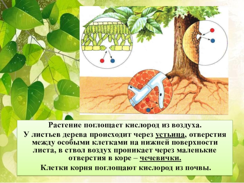 между особыми клетками на нижней поверхности листа, в ствол воздух проникает через маленькие отверстия в коре – чечевички.