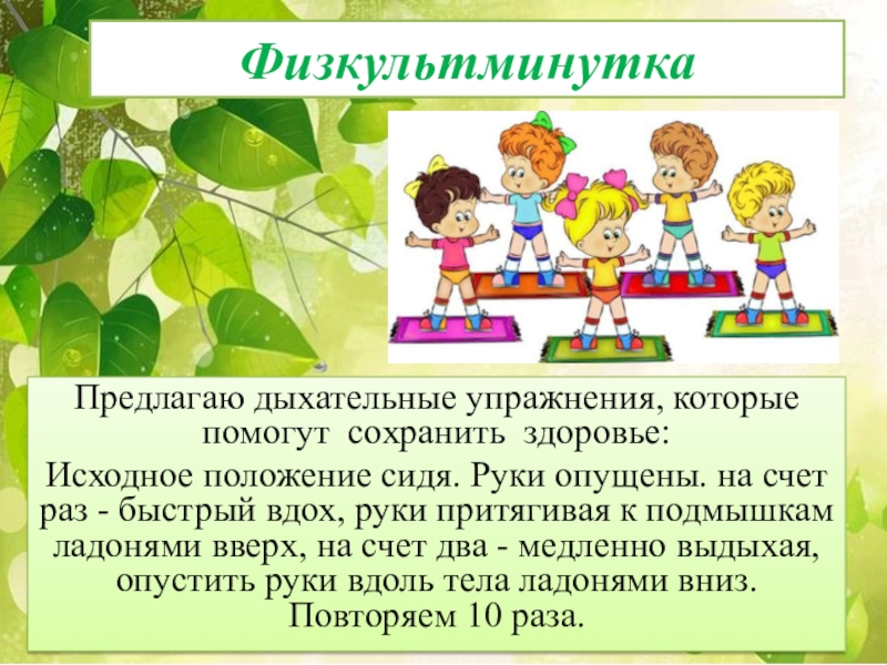 на счет раз - быстрый вдох, руки притягивая к подмышкам ладонями вверх, на счет два - медленно выдыхая, опустить руки вдоль тела ладонями вниз. Повторяем 10 раза.