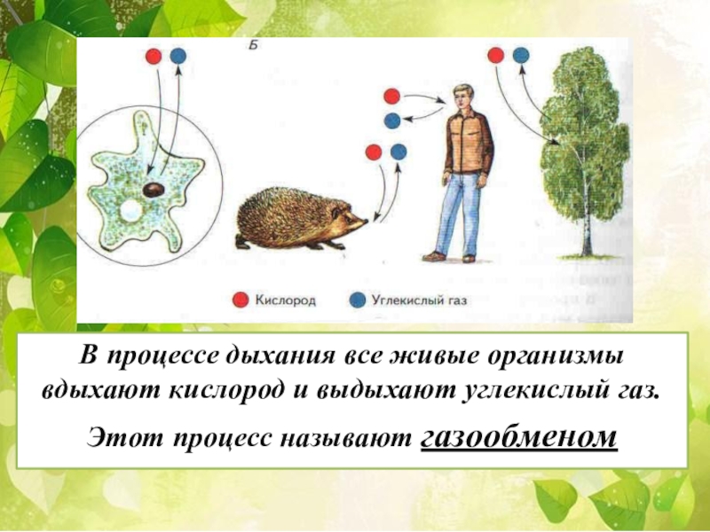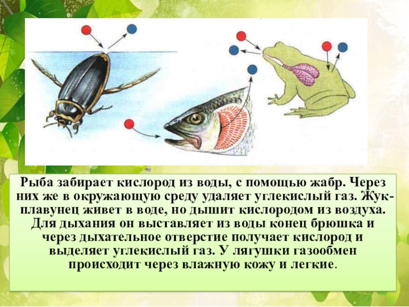 в окружающую среду удаляет углекислый газ. Жук-плавунец живет в воде, но дышит кислородом из воздуха. Для дыхания он выставляет из воды конец брюшка и через дыхательное отверстие получает кислород и выделяет углекислый газ. У лягушки газообмен происходит через влажную кожу и легкие.