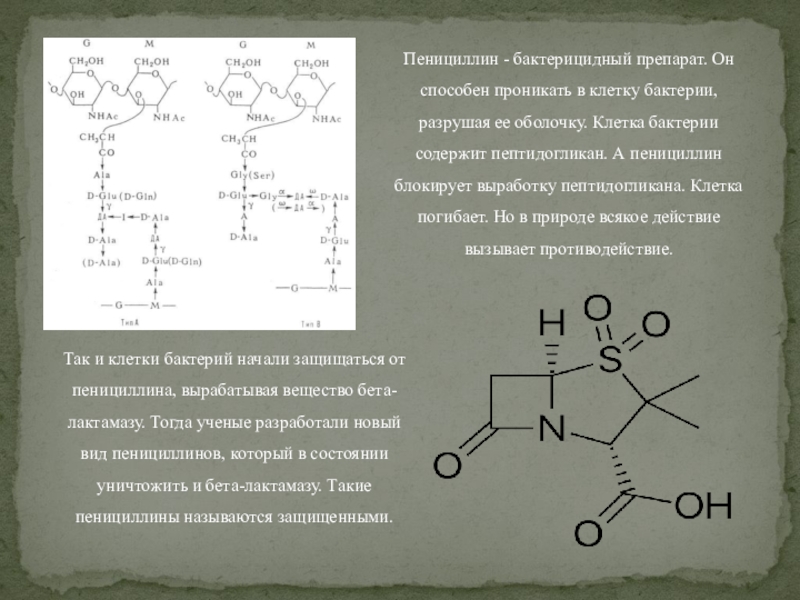 Так и клетки бактерий начали защищаться от пенициллина, вырабатывая вещество бета-лактамазу. Тогда ученые разработали новый вид пенициллинов, который в состоянии уничтожить и бета-лактамазу. Такие пенициллины называются защищенными.