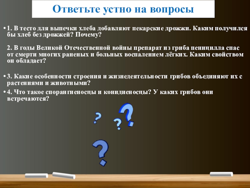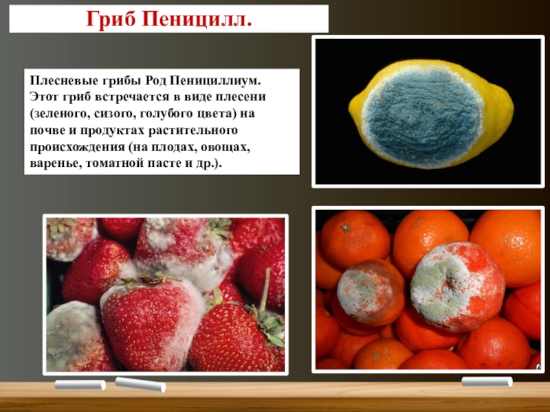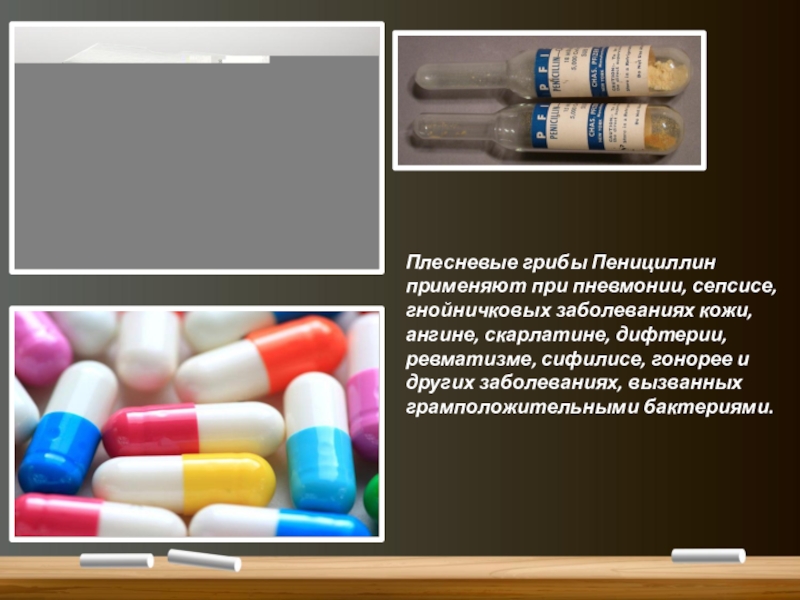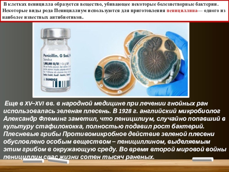 Еще в XV–XVI вв. в народной медицине при лечении гнойных ран использовалась зеленая плесень. В 1928 г. английский микробиолог Александр Флеминг заметил, что пеницилиум, случайно попавший в культуру стафилококка, полностью подавил рост бактерий. Плесневые грибы Противомикробное действие зеленой плесени обусловлено особым веществом – пенициллином, выделяемым этим грибом в окружающую среду. Во время второй мировой войны пенициллин спас жизни сотен тысяч раненых.