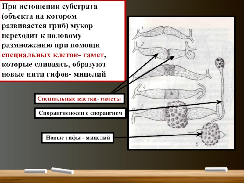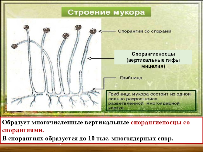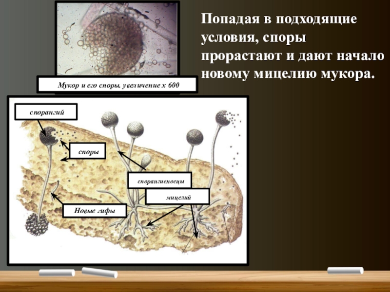 Попадая в подходящие условия, споры прорастают и дают начало новому мицелию мукора.