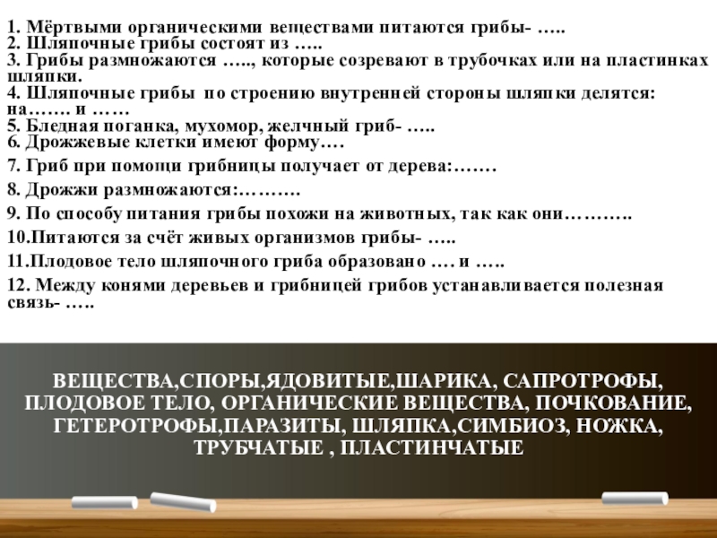 ВЕЩЕСТВА,СПОРЫ,ЯДОВИТЫЕ,ШАРИКА, САПРОТРОФЫ, ПЛОДОВОЕ ТЕЛО, ОРГАНИЧЕСКИЕ ВЕЩЕСТВА, ПОЧКОВАНИЕ,ГЕТЕРОТРОФЫ,ПАРАЗИТЫ, ШЛЯПКА,СИМБИОЗ, НОЖКА, ТРУБЧАТЫЕ , ПЛАСТИНЧАТЫЕ