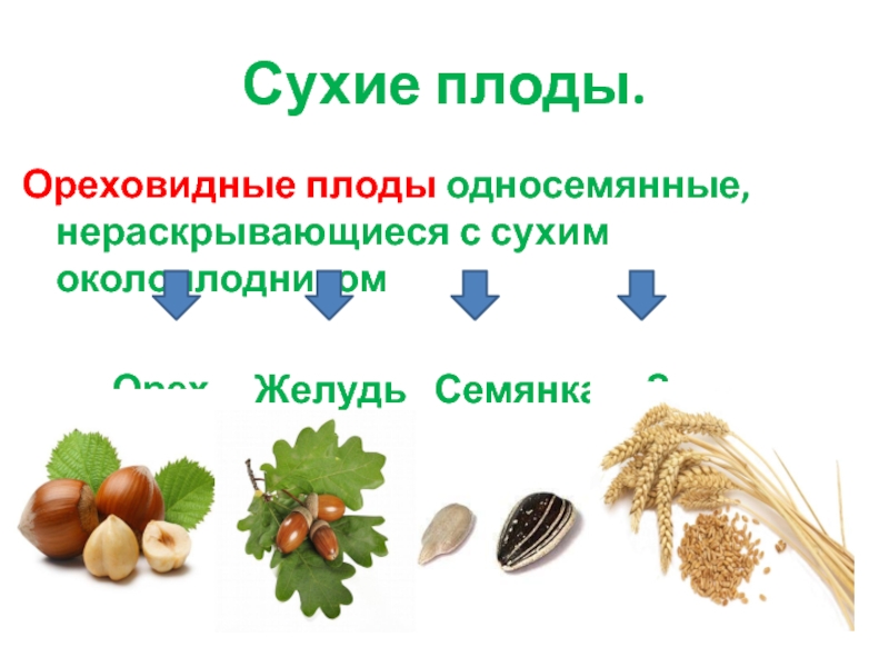 Сухие плоды.Ореховидные плоды односемянные, нераскрывающиеся с сухим околоплодником     Орех   Желудь