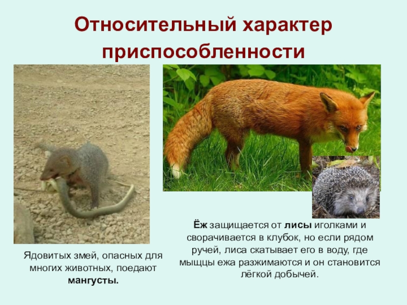 Ёж защищается от лисы иголками и сворачивается в клубок, но если рядом ручей, лиса скатывает его в воду, где мыщцы ежа разжимаются и он становится лёгкой добычей.
