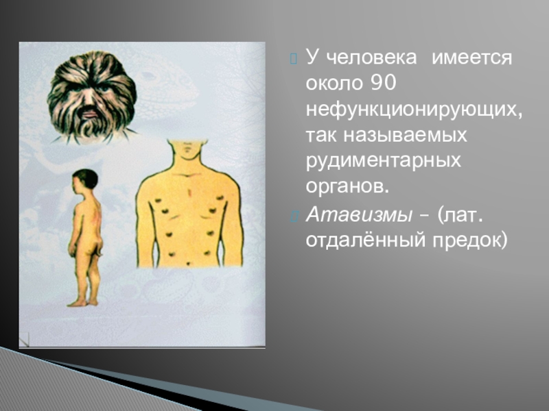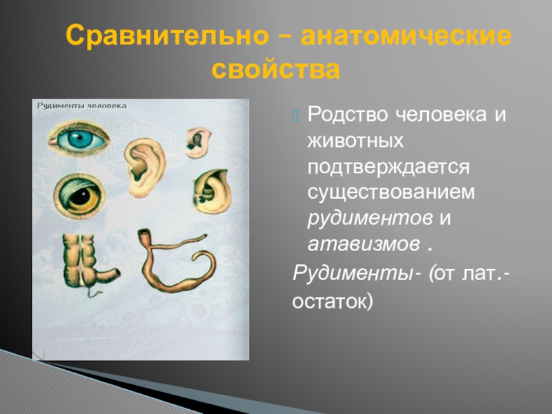 Родство человека и животных подтверждается существованием рудиментов и атавизмов .