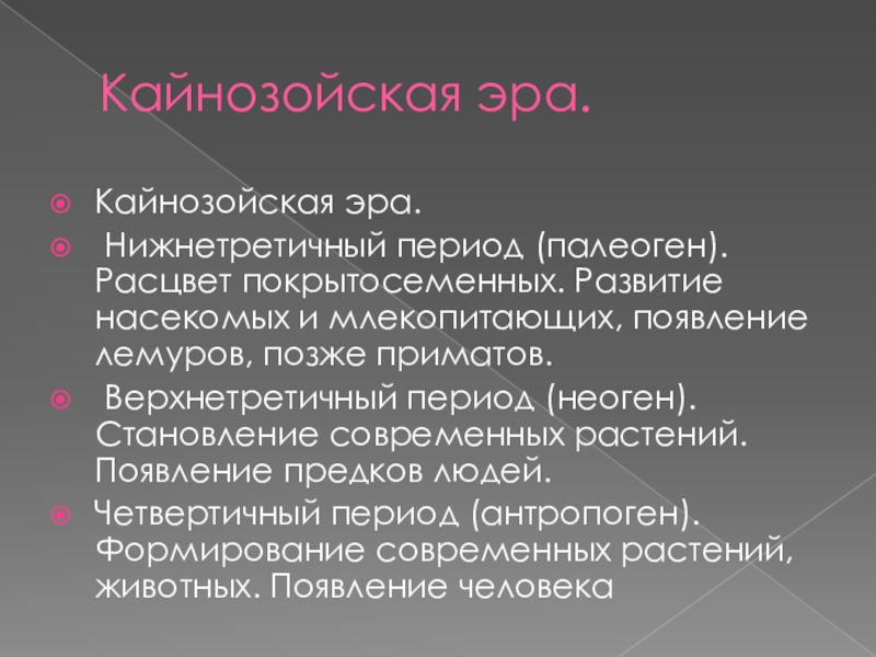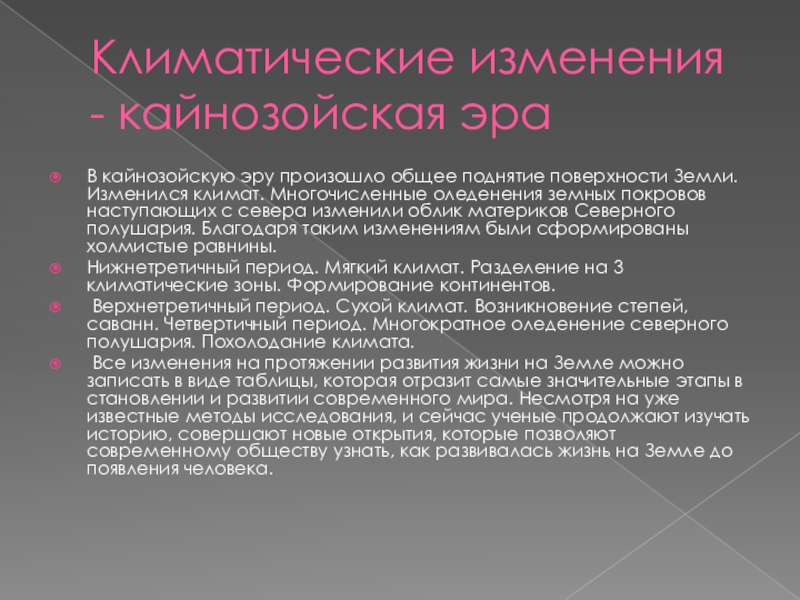 Верхнетретичный период. Сухой климат. Возникновение степей, саванн. Четвертичный период. Многократное оледенение северного полушария. Похолодание климата.