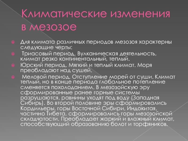 Меловой период. Отступление морей от суши. Климат теплый, но в конце периода глобальное потепление сменяется похолоданием. В мезозойскую эру сформированные ранее горные системы разрушаются, равнины уходят под воду (Западная Сибирь). Во второй половине эры сформировались Кордильеры, горы Восточной Сибири, Индокитая, частично Тибета, сформировались горы мезозойской складчатости. Преобладает жаркий и влажный климат, способствующий образованию болот и торфяников.