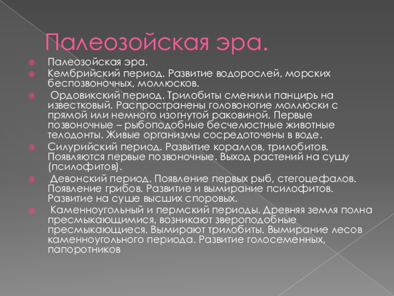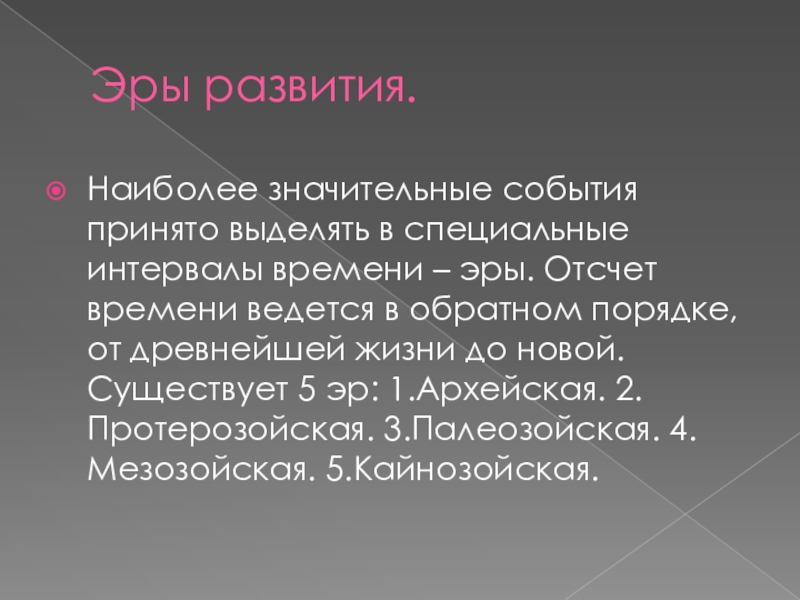 эры. Отсчет времени ведется в обратном порядке, от древнейшей жизни до новой. Существует 5 эр: 1.Архейская. 2.Протерозойская. 3.Палеозойская. 4.Мезозойская. 5.Кайнозойская.