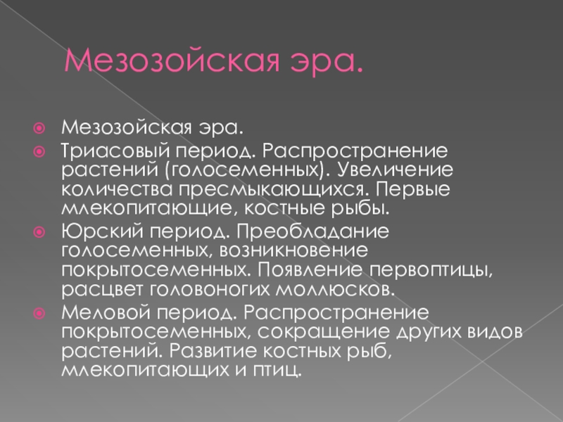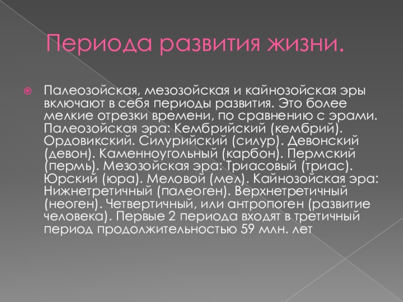 развития. Это более мелкие отрезки времени, по сравнению с эрами. Палеозойская эра: Кембрийский (кембрий). Ордовикский. Силурийский (силур). Девонский (девон). Каменноугольный (карбон). Пермский (пермь). Мезозойская эра: Триасовый (триас). Юрский (юра). Меловой (мел). Кайнозойская эра: Нижнетретичный (палеоген). Верхнетретичный (неоген). Четвертичный, или антропоген (развитие человека). Первые 2 периода входят в третичный период продолжительностью 59 млн. лет