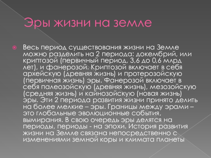 на 2 периода: докембрий, или криптозой (первичный период, 3,6 до 0,6 млрд лет), и фанерозой. Криптозой включает в себя архейскую (древняя жизнь) и протерозойскую (первичная жизнь) эры. Фанерозой включает в себя палеозойскую (древняя жизнь), мезозойскую (средняя жизнь) и кайнозойскую (новая жизнь) эры. Эти 2 периода развития жизни принято делить на более мелкие – эры. Границы между эрами – это глобальные эволюционные события, вымирания. В свою очередь эры делятся на периоды, периоды - на эпохи. История развития жизни на Земле связана непосредственно с изменениями земной коры и климата планеты